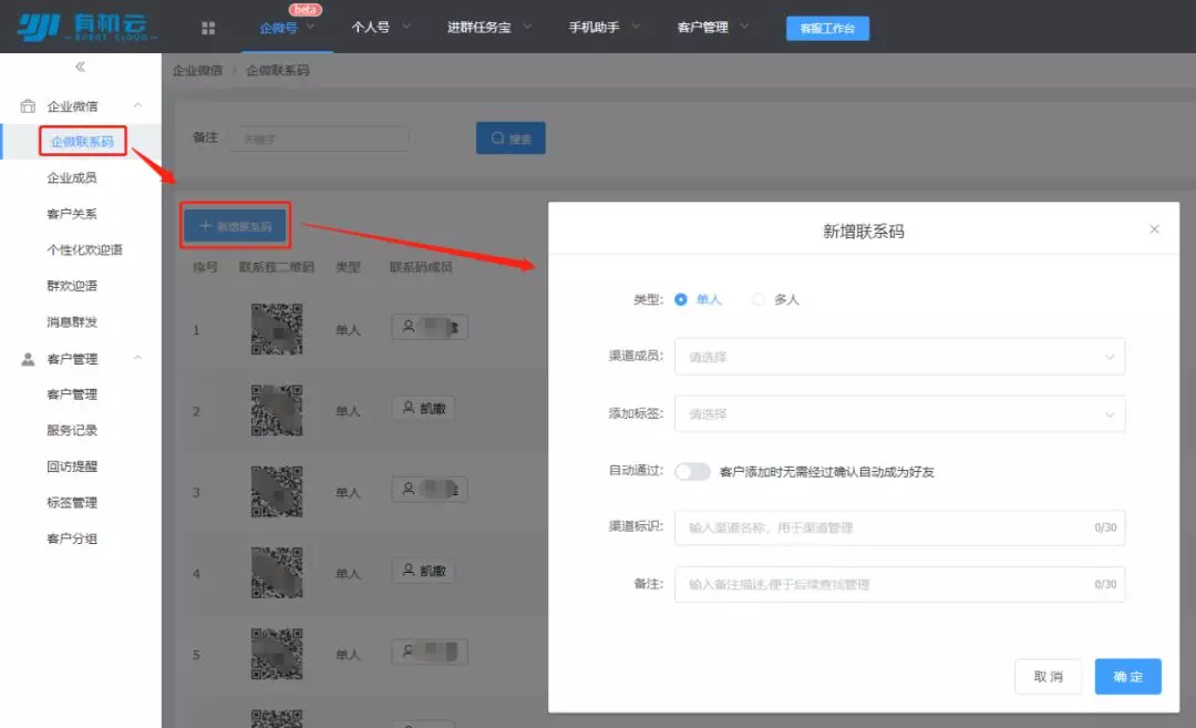 2.新增联系码,设置活码标签标识,活码会统计不同渠道来源的用户并打上对应标签。