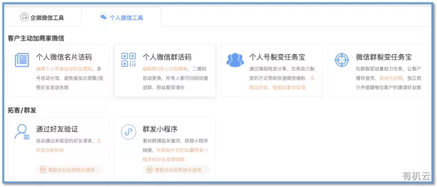 企微微信工具包括商家主动加粉、客户主动加好友以及消息群发等三大主要功能。